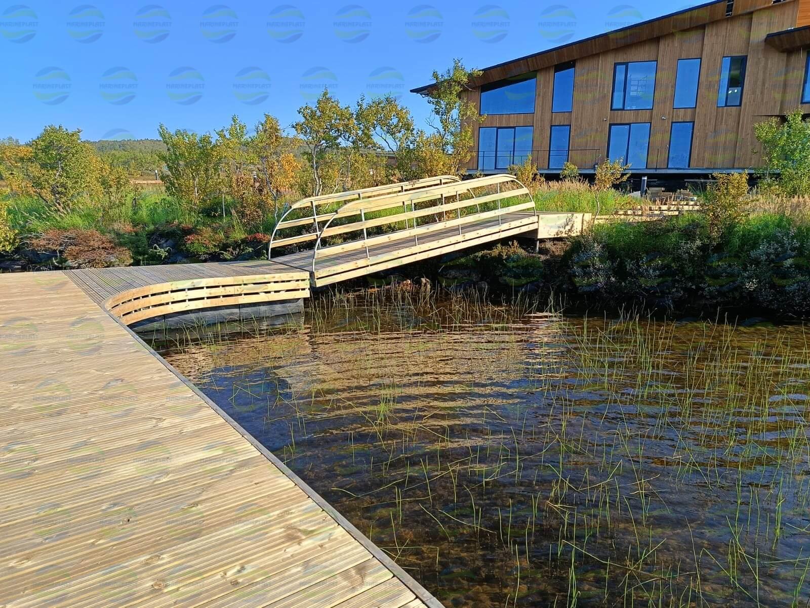 Понтонное сооружение предоставляет безопасный доступ к воде для посетителей природных зон, минимизируя антропогенное воздействие на береговую линию и экосистему водоёма. Гармоничные обводы и индивидуальная конфигурация позволяют площадке органично вписаться в естественный ландшафт, создавая привлекательную рекреационную и фотографическую точку.