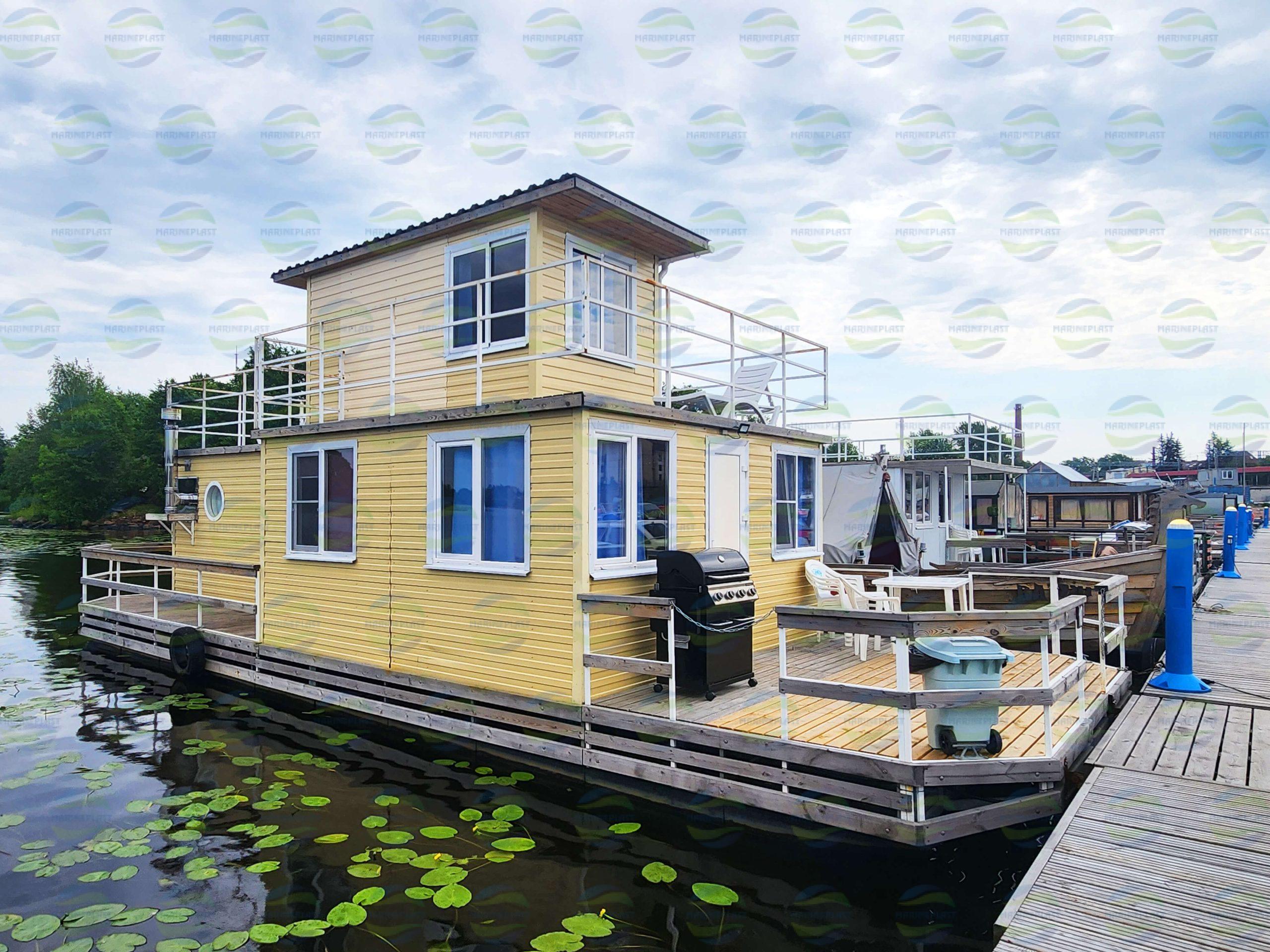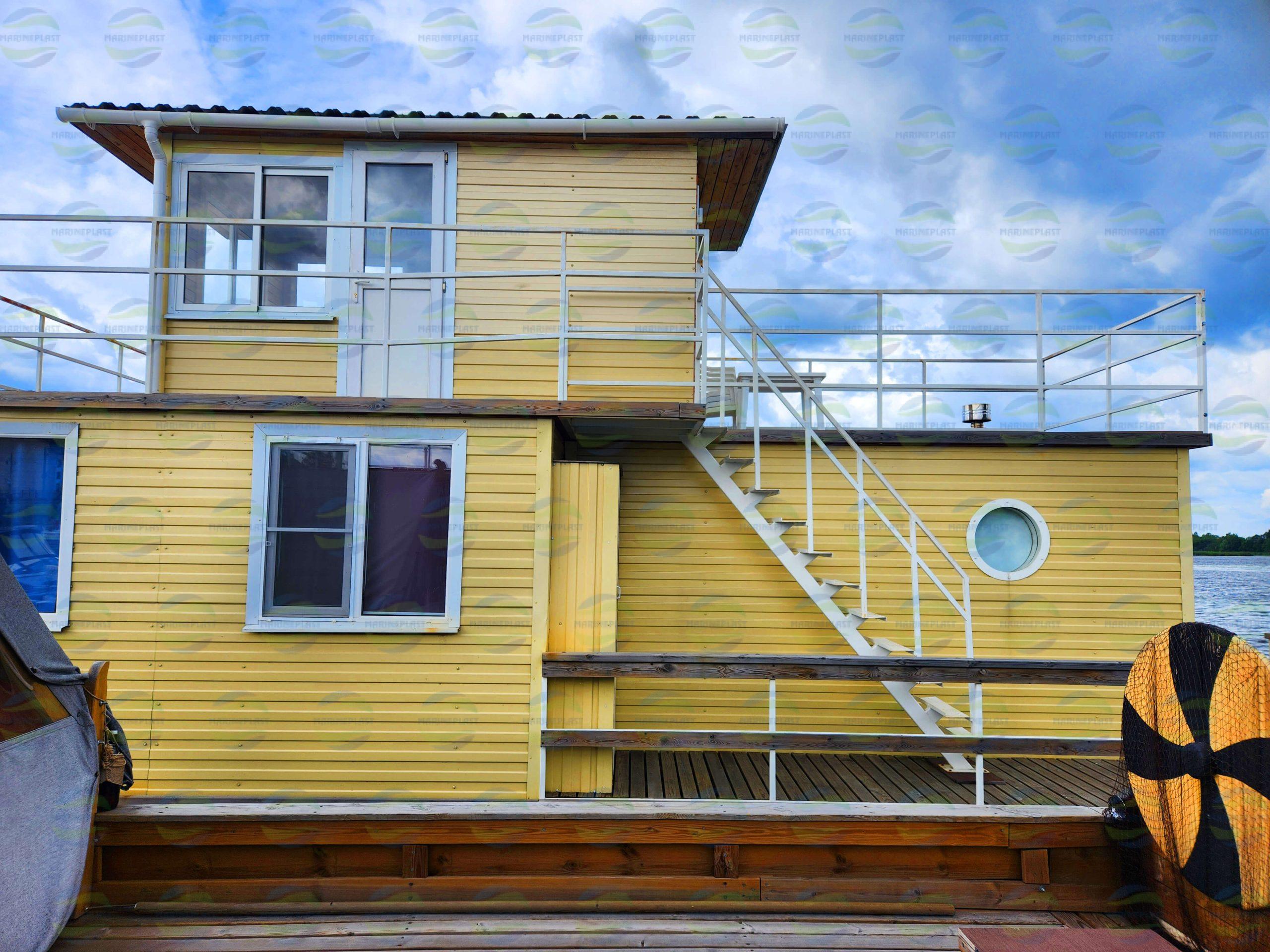 Помимо внутренних помещений, плавдом имеет три открытые палубы: носовую, кормовую и верхнюю, где можно поставить шезлонги и кресла для отдыха, столики для совместной трапезы или барбекю. На верхней палубе возможна установка навеса или беседки. Также возможна установка навесного мотора.