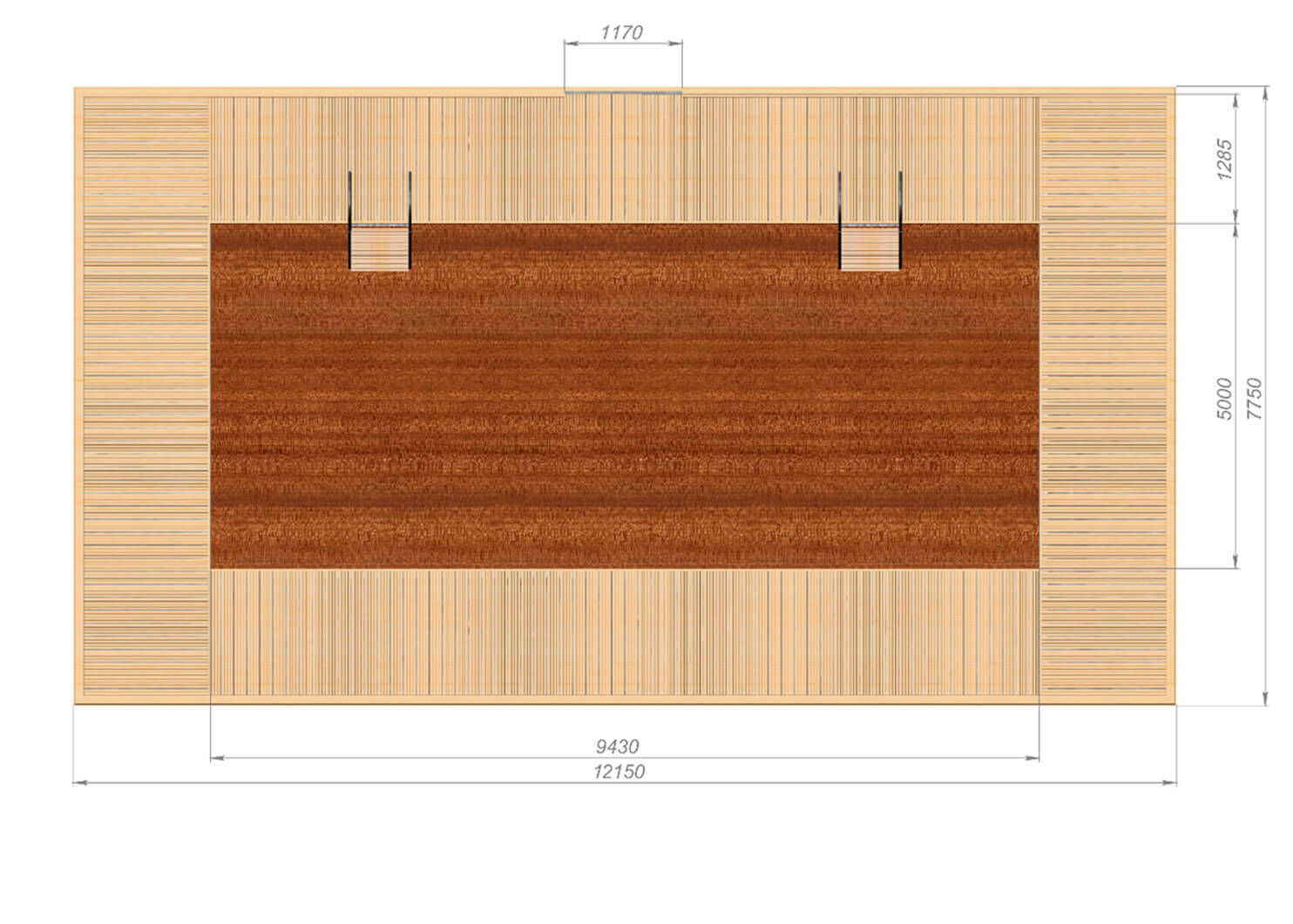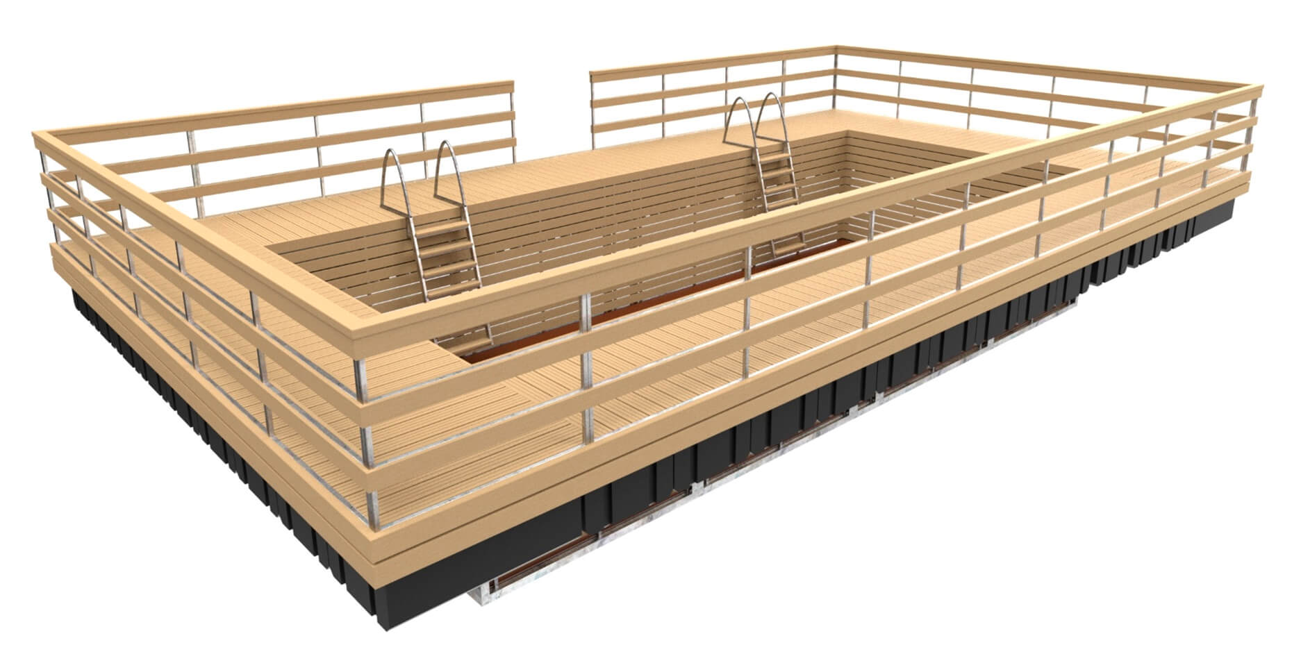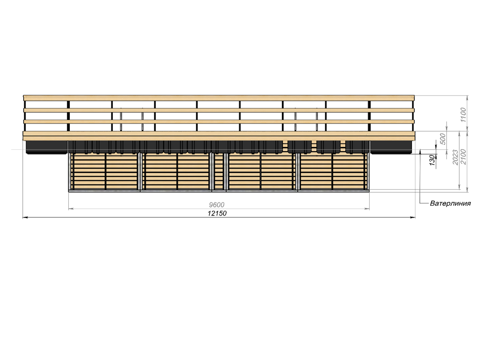 Основой конструкции понтона является стальная оцинкованная рама. Палубный настил и внутренняя обшивка купели выполнены из импрегнированной доски, напольное покрытие купели – из влагостойкой фанеры.