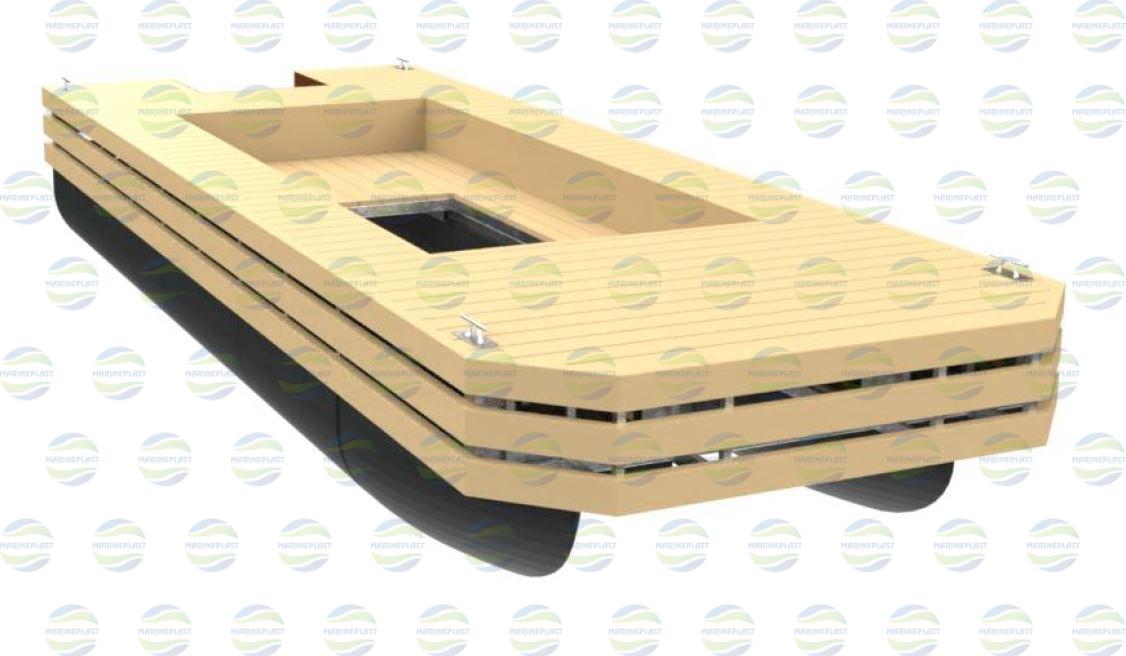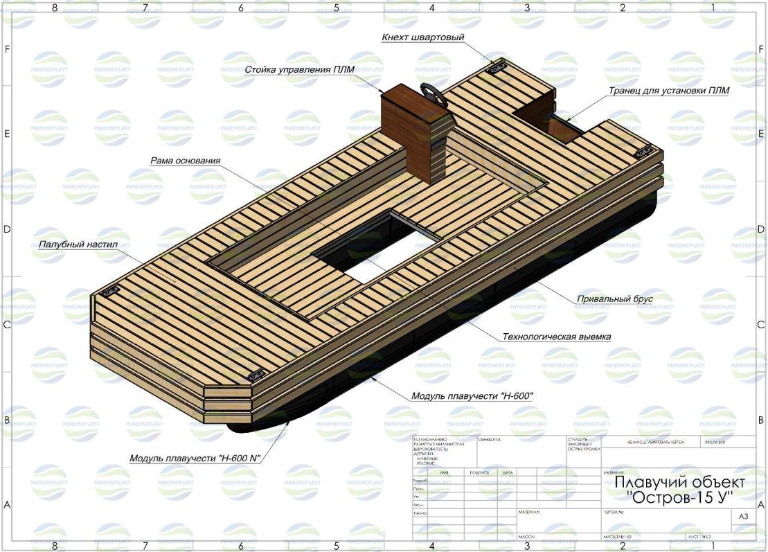 Рабочий понтон модели «Остров-15» с размерами 6,45×2,4×1,01 м выполнен в форме катамарана с двумя полиэтиленовыми поплавками.